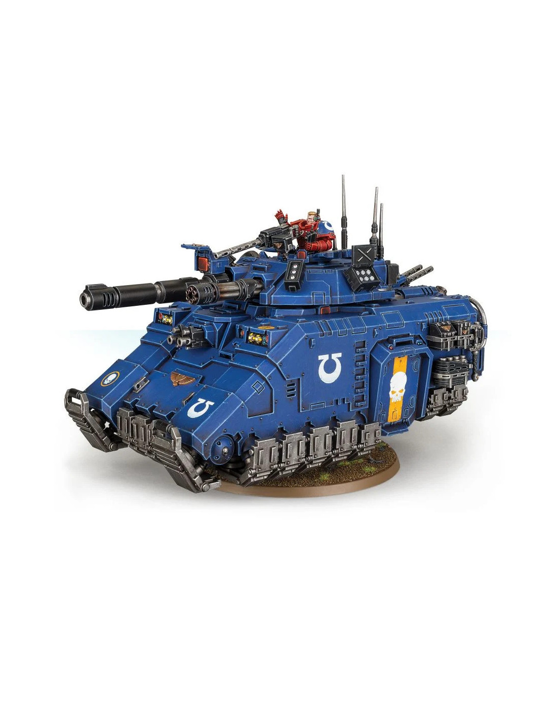 • Il est équipé d'un macro-incinérateur à plasma ou d'un destructeur laser lourd en tourelle, d'un canon gatling Onslaught lourd coaxial, de deux lance-grenades Fragstorm, de deux bolters Storm, d'une mitrailleuse Ironhail Icarus jumelée, d'une mitrailleuse Ironhail et d'un bolter lourd jumelé de coque.